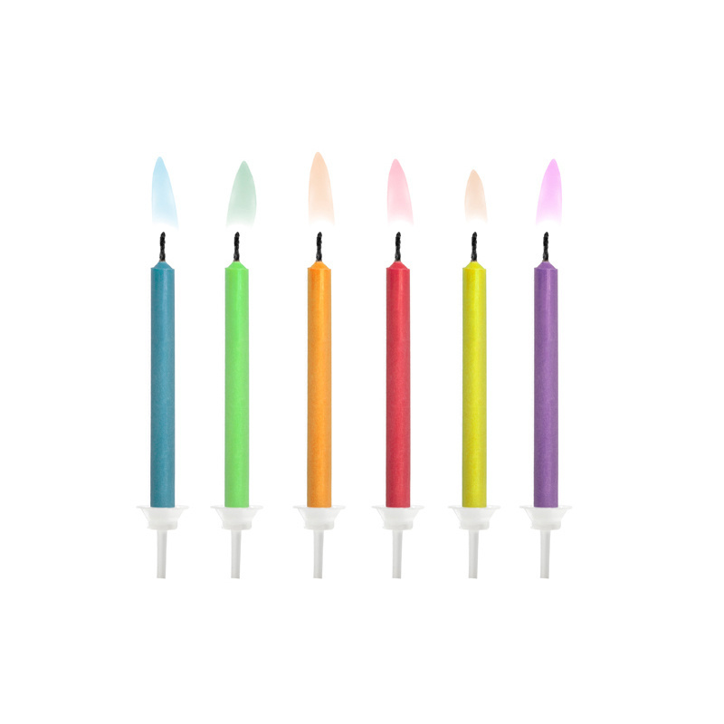 - Kaarsjes Multikleur met Gekleurde Vlam- Afmetingen: 6cm- Bestaande uit: 6 kaarsjes met 6 houders