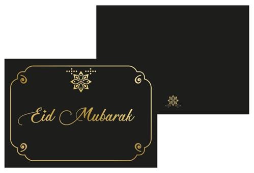 - Kaart Eid Mubarak - Zwart/Goud- Afmeting: A5- Aantal per verpakking: 1- Materiaal: Karton- Inclusief Envelop