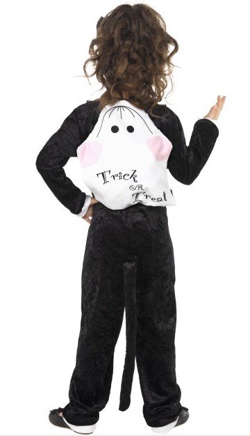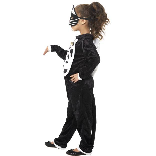 -Kinder kattenkostuum zwart bestaande uit de Bodysuit met een belletje en het Oogmasker