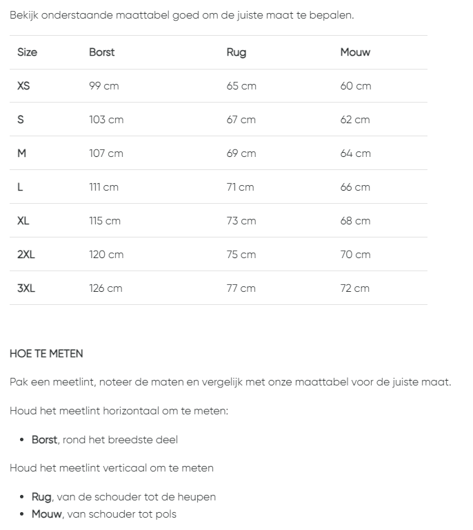 - Beschikbare maten: XS t/m 3XL (zie laatste afbeelding voor extra maatinformatie)