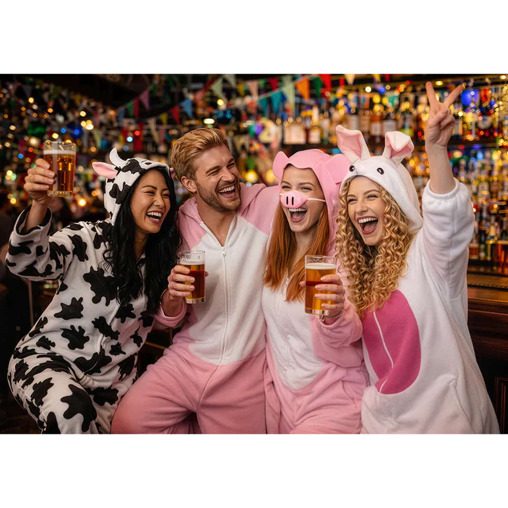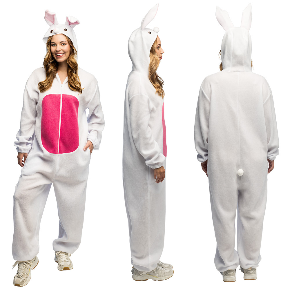Met deze schattige konijnenonesie voor volwassenen ben je gegarandeerd de meest aaibare persoon op het feest. De zachte witte stof, de opvallende roze buik, het schattige bolletje als staart en de capuchon met lange konijnenoren maken dit pak onweerstaanbaar leuk. Het kostuum ziet er niet alleen leuk uit maar heeft ook handige zakken waarin gemakkelijk kleine spullen zoals geld, sleutels of een telefoon in opgeborgen kunnen worden. Perfect dus voor carnaval, een foute party, een grappig themafeest, pasen, vrijgezellenfeesten of als cozy loungewear. Het unisex pak is geschikt voor zowel mannen als vrouwen. Daarom is dit kostuum ook ideaal als matching outfit voor koppels of vrienden.