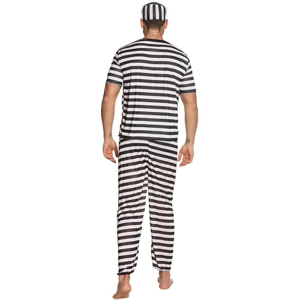 Het gevangenenkostuum bestaat uit een gestreepte gevangenisoutfit met een authentieke look. Het ontwerp is zorgvuldig afgestemd op de klassieke boevenlook, met een comfortabele pasvorm zodat je vrij kunt bewegen terwijl je je ontsnappingsplannen beraamt.