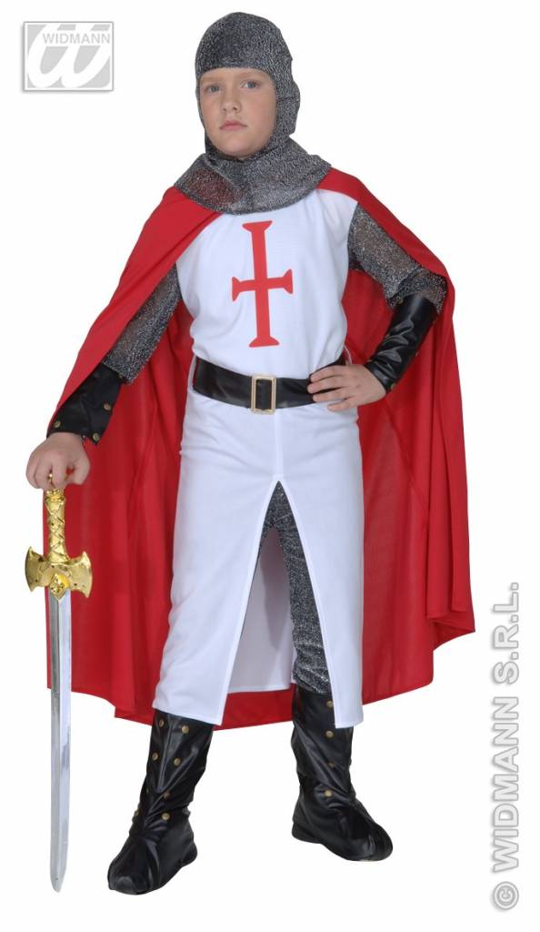 - Kruisvaarder kostuum jongen bestaande uit: Lange jas, Broek, Riem, Armbanden, Helm, Schoenhoezen, Cape