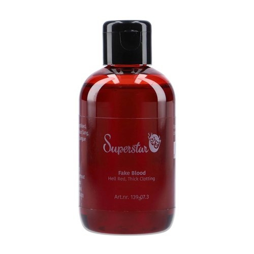 Superstar Nep Bloed, Hel Rood Dik stollend is een mooi en helder kunstbloed. Het is vrij dik en blijft mooi op de aangebrachte plek zonder uit te lopen en kan gebruikt worden voor het maken van o.a. bloederige wonden. Het bloed stolt. Door licht en donker bloed te combineren creëer je een mooi resultaat. Ideaal voor wonden en Halloween. Superstar Nep Bloed Hel Rood Dik zit verpakt in een plastic fles met handige doseerdop.