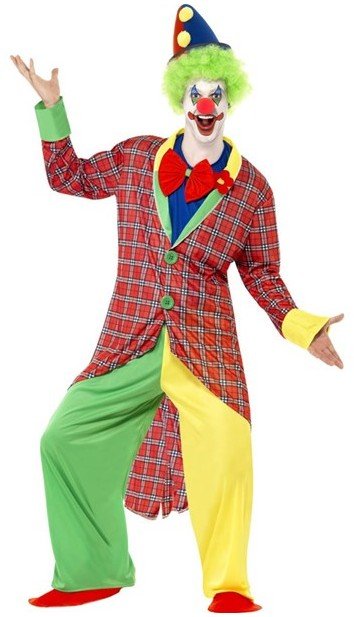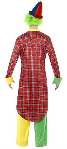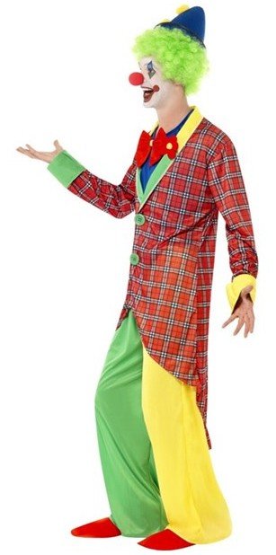 -La Circus Clown kostuum bestaande uit een lange gekleurde jas, een gekleurde broek, een stukje van een blauw shirt met daarop een rode strik en rode schoenstukken.