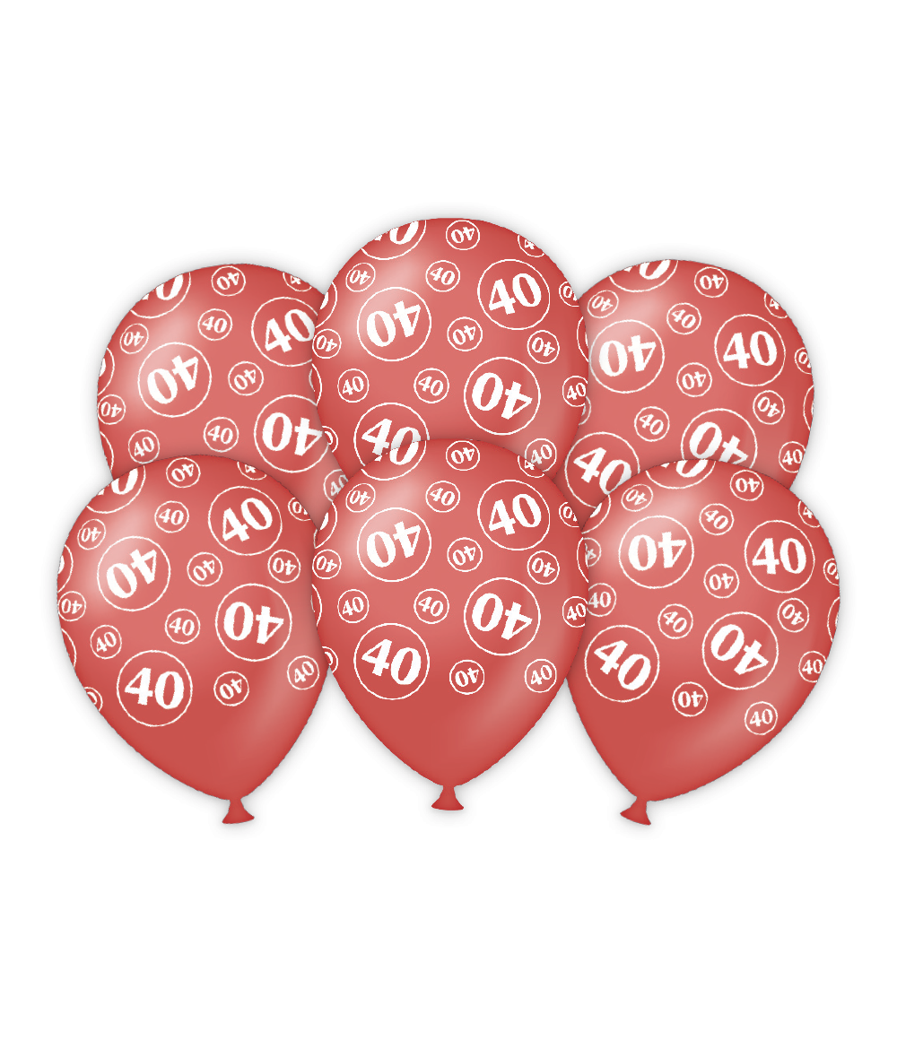 - Latexballonnen rood 40-jarig jubileum (6st) - Diameter: ± 30 cm - Inhoud: Leeg (standaard) - Geschikt voor: Helium en lucht - Zweeftijd (helium): 12-14 uur - Materiaal: Latex