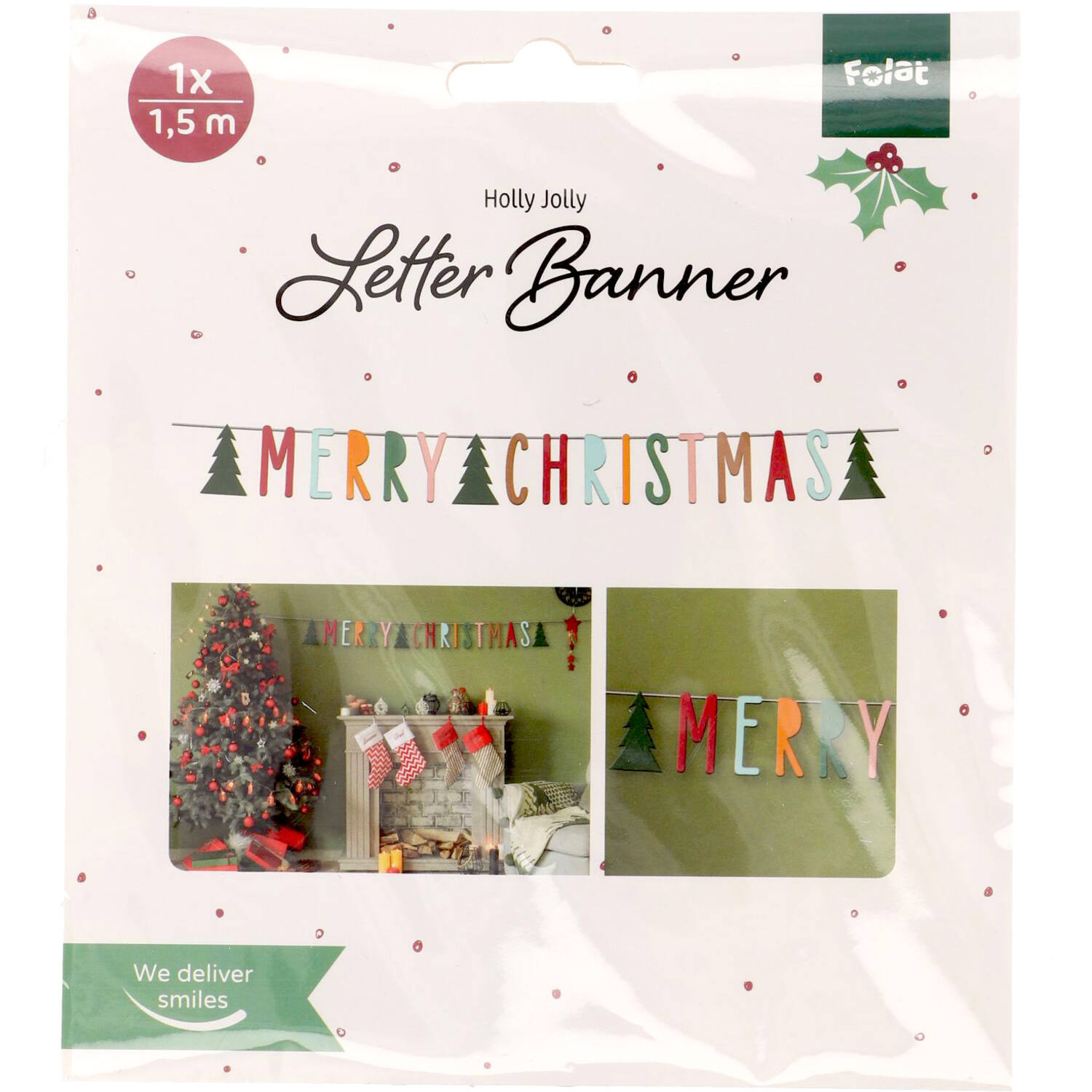 Vrolijk Kerstfeest! Letterslinger 'Merry Christmas', Holly Jolly, 1,5 meter. Deze letterslinger zorgt meteen voor een vrolijke kerstsfeer. De afmetingen zijn 150 x 12 cm. De letters en de kerstbomen zijn eenzijdig bedrukt en gemaakt van papier. De slinger is gemaakt van plastic.