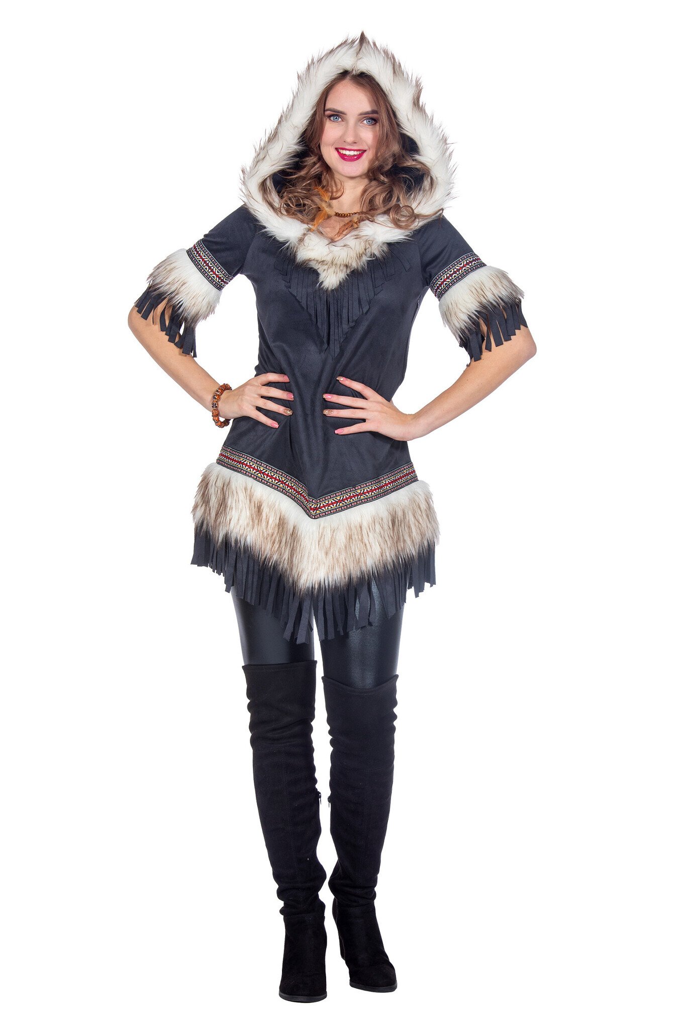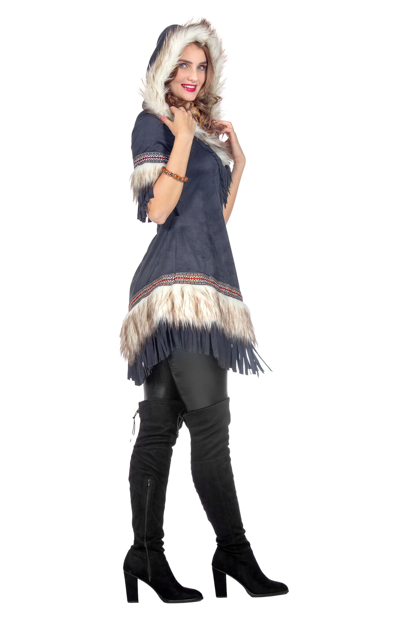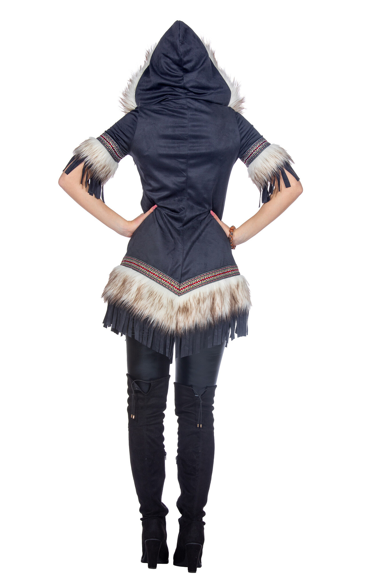 - Details: de jurk heeft een capuchon en is afgewerkt met nep bont, franjes en bewerkt band