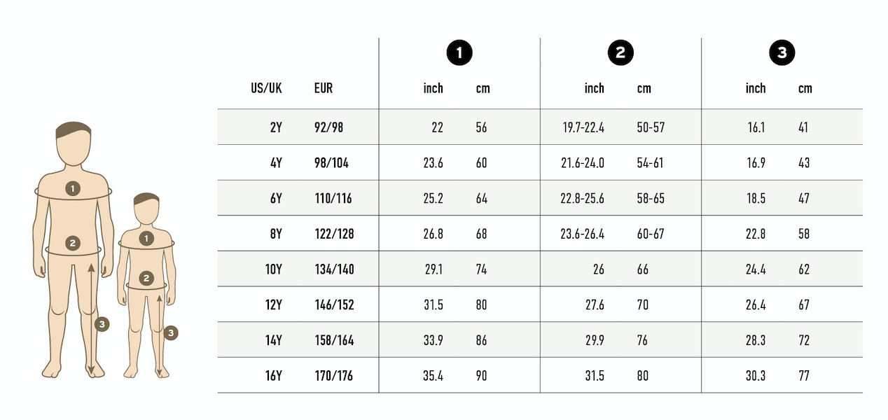 | Leeftijd | Maat | Borst omtrek | Heup omtrek | Been lengte |