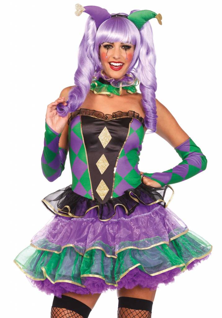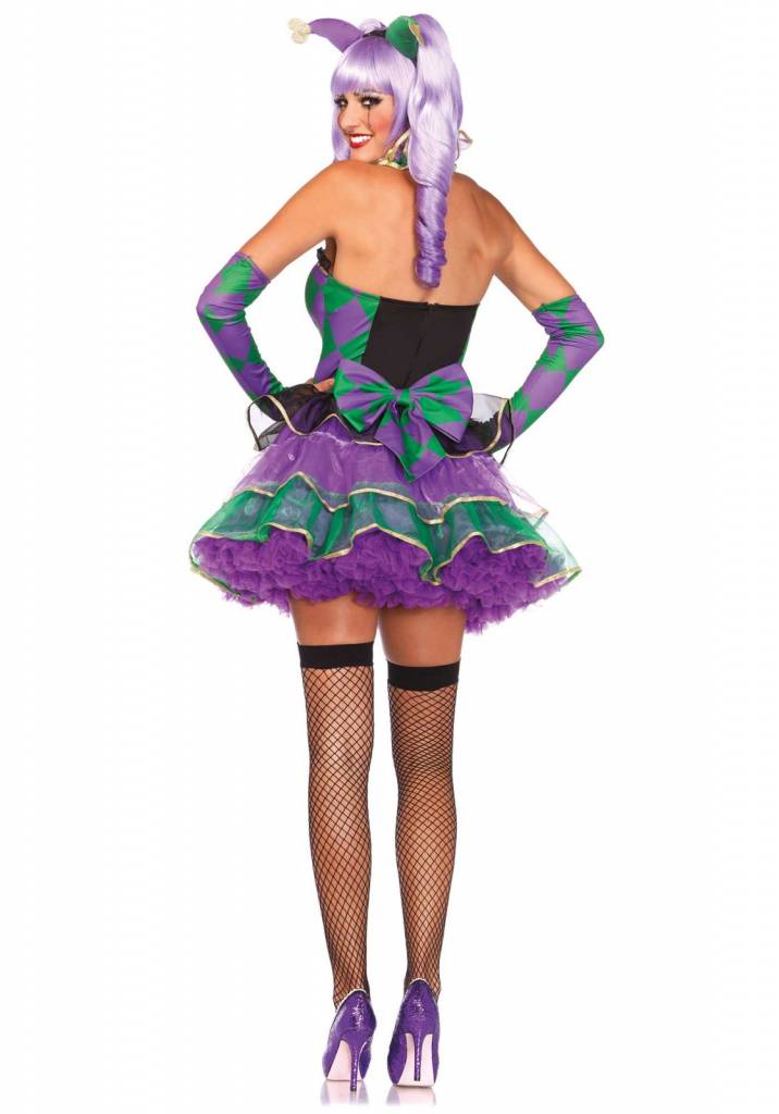 Dit vijfdelig Mardi Gras kostuum bestaat uit een jurk met een rok met lagen en afneembare doorzichtige bandjes voor de top, halsband met ruches, bijpassende handschoenen en haarband met hoorns.
