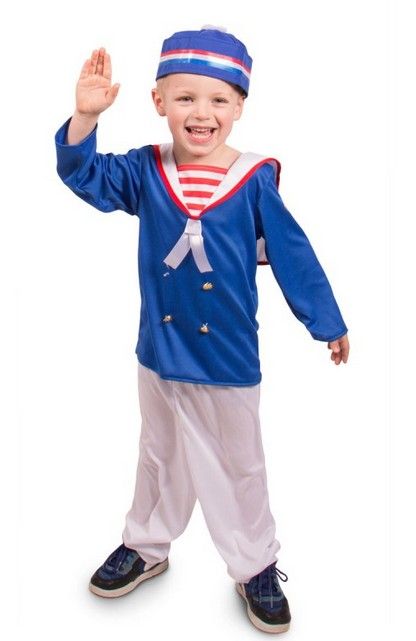 -Matrozenpakje kind 3-delig bestaande uit Matrozenjasje, witte broek en een blauwe matrozenhoed.