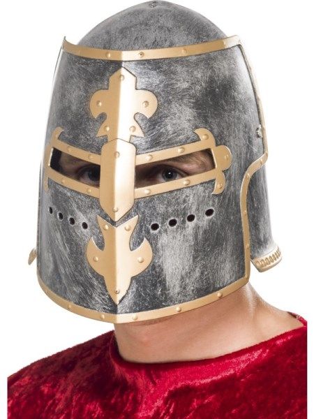 Middeleeuwse Ridderhelm met beweegbare gezicht gemaakt van hard plastic met een glanzend zwart/witte afwerking. De helm is voorzien van een toegevoegde beweegbare voorzijde!