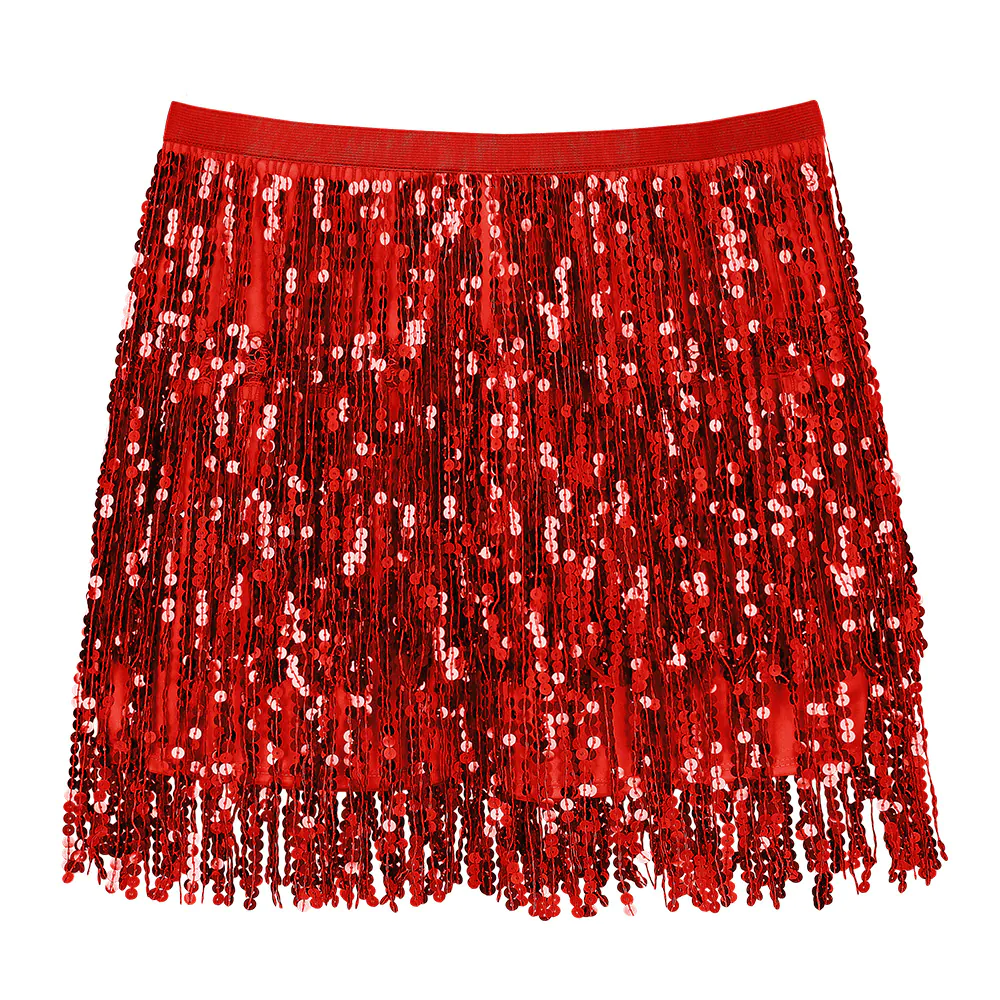 Deze feestelijke fringe rok is volledig bedekt met rode pailletten en afgewerkt met lange franjes die soepel meebewegen bij iedere stap of dans. De elastische tailleband zorgt voor een comfortabele pasvorm, terwijl de glanzende afwerking direct zorgt voor een opvallende partylook. Perfect voor themafeesten, carnaval, kerst of een avond vol glitter en glamour.