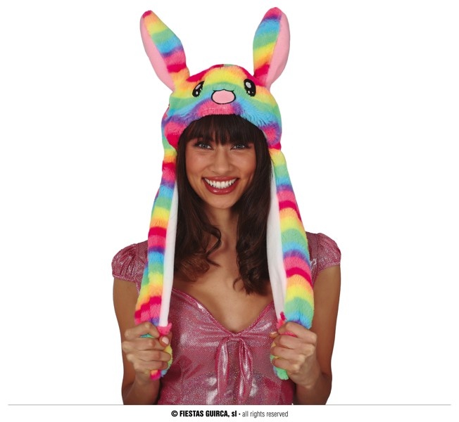 - Multikleur Konijnenmuts Met Beweging- Doormiddel van een drukknopje in de onderkant van de muts, gaan de oren omhoog- Materiaal: 100% Polyester