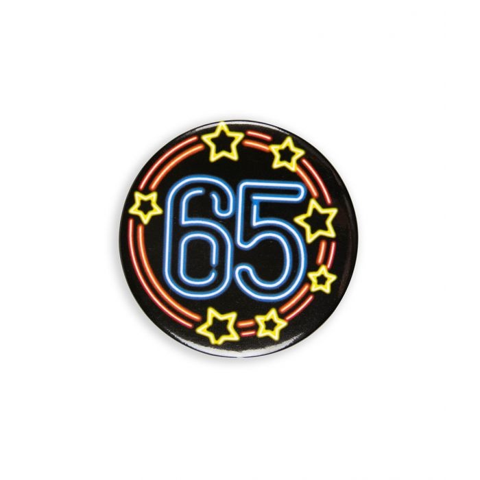 - Neon Button 65 Jaar- Doorsnede: 5,5 cm- Materiaal: Plastic en ijzer