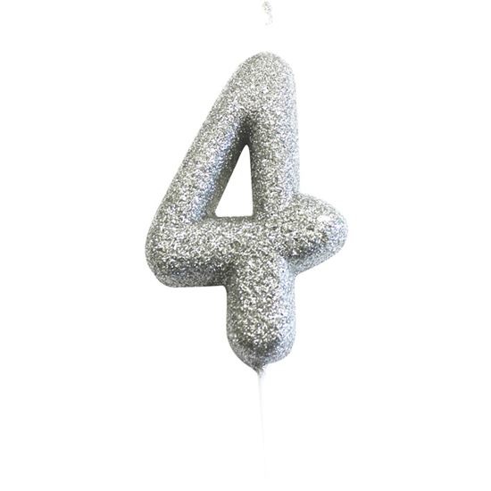 - Nummerkaars '4' Glitter Zilver- Aantal: 1 kaars per verpakking- Afmetingen: 7cm