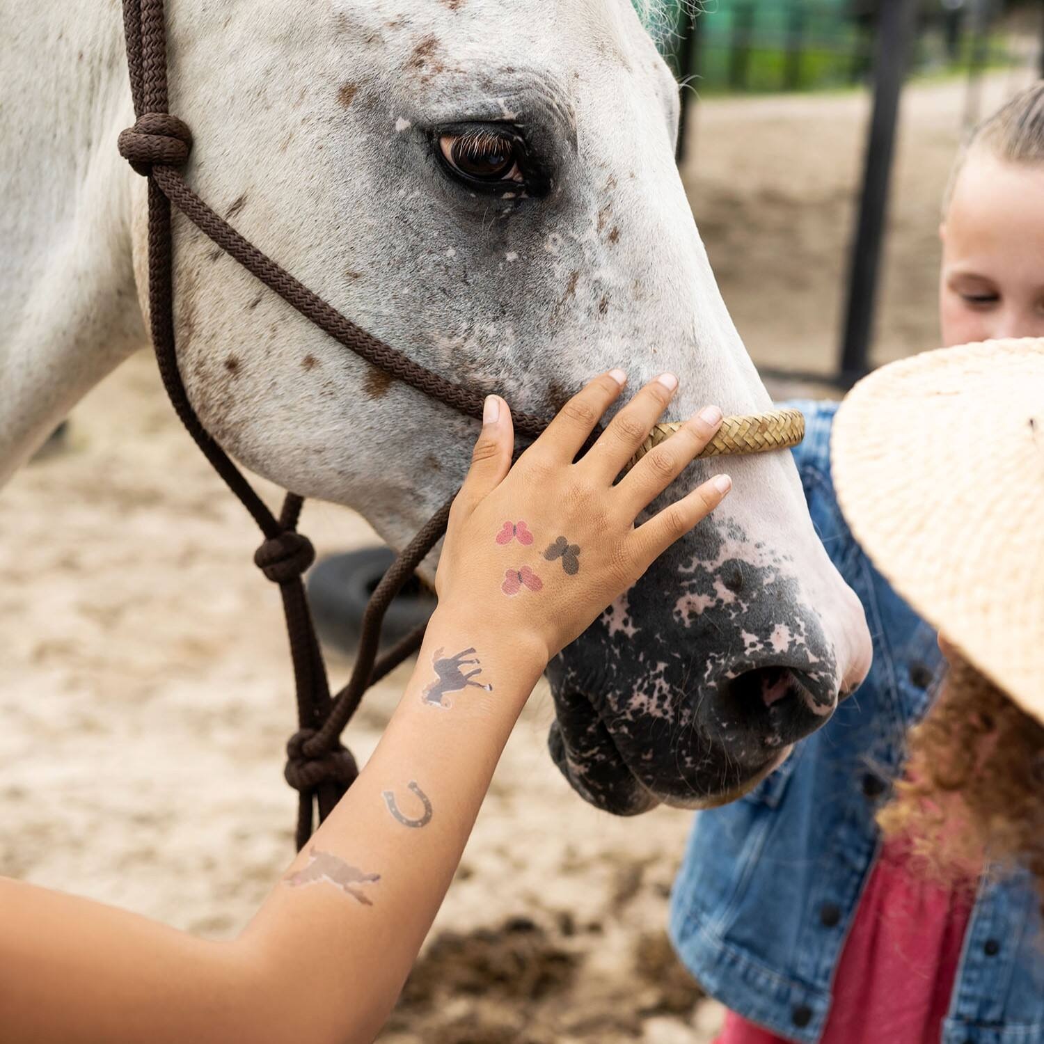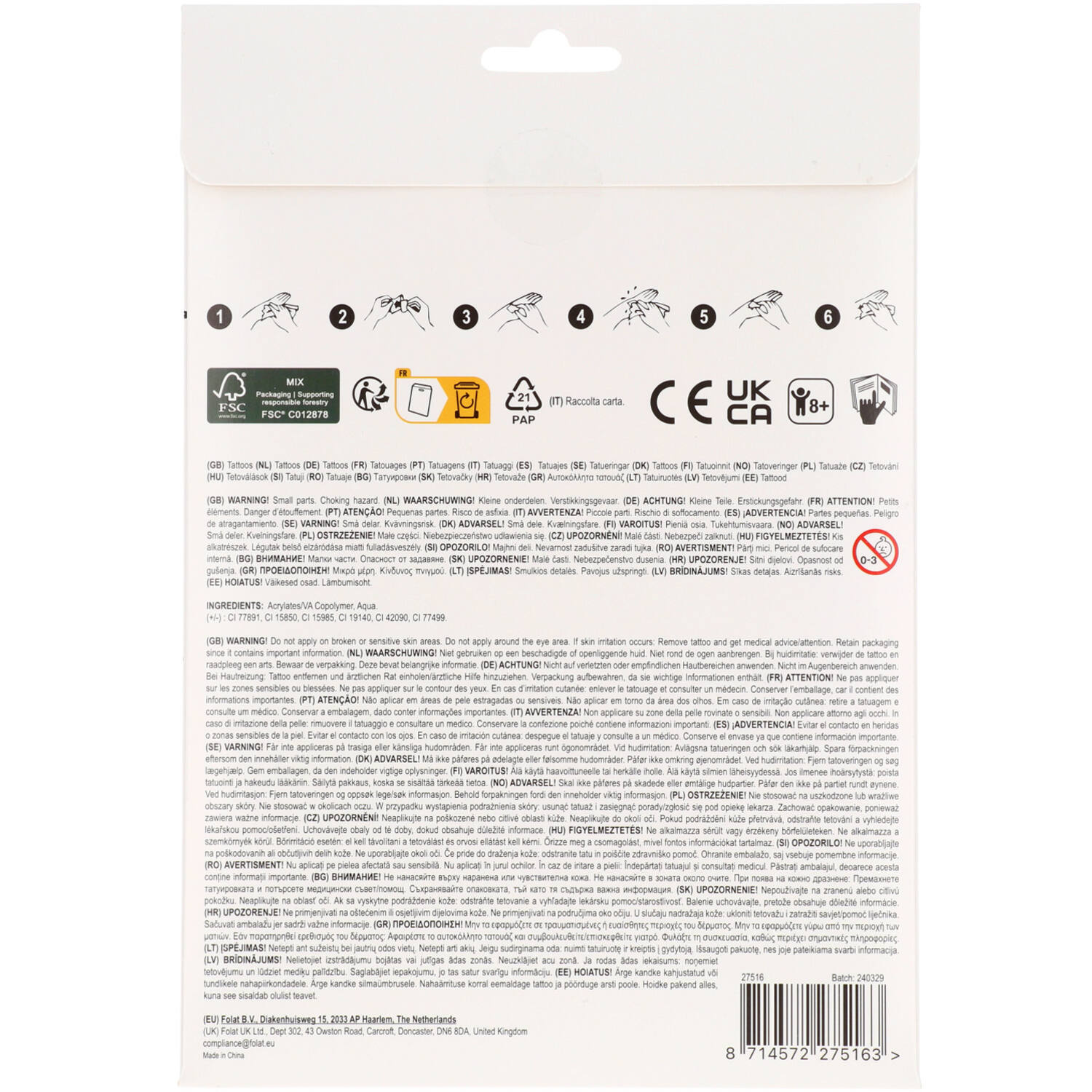 Voor de echte paardenfans! Tattoos - Happy Horses - 25 stuks. Inhoud: 1 tattoo stickervel met 25 tattoos. Bijvoorbeeld te gebruiken tijdens de volgende feestgelegenheid/feestgelegenheden: Kinderfeestje, Verjaardag, Themafeest. Super leuke neptattoo's voor echte paardenfans. Er zit 1 tattoo stickervel in de verpakking met daarop 25 tattoos. Op de achterzijde van de verpakking staat hoe de tattoo's gebruikt moeten worden. Het stickervel is 14 x 21 cm groot. Deze tattoos horen bij de Happy Horses collectie van Folat. Dit artikel is gemaakt van Acrylaten/VA copolymeer en water.