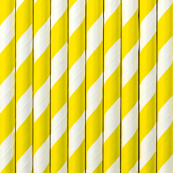 - Papieren Rietjes Geel/Wit- Aantal: 10 stuks per verpakking- Afmetingen: 19,5cm- Materiaal: Papier
