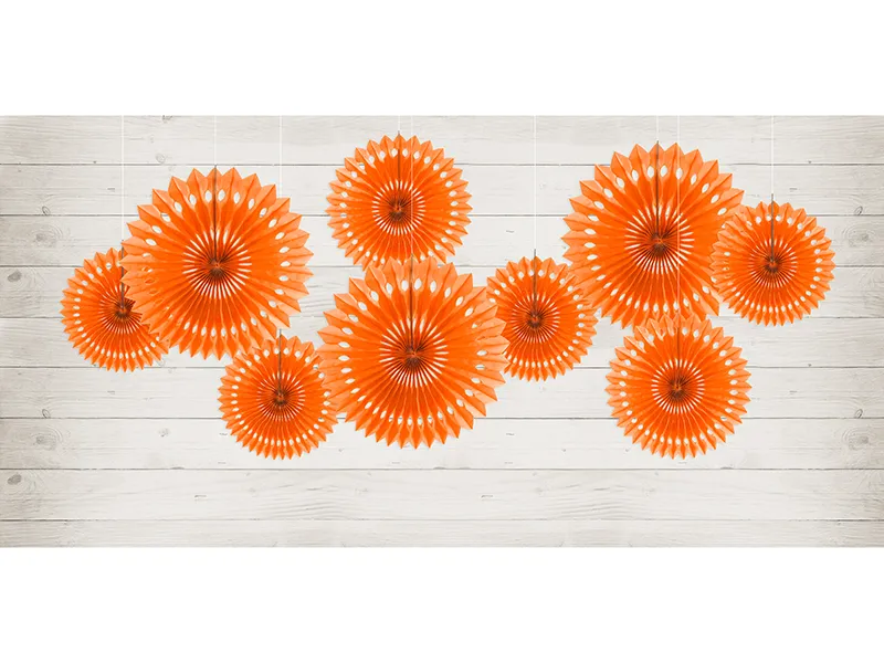 - Papieren Waaiers Set Oranje 3-delig- Inhoud: 3 decoratieve waaiers in 3 maten, inclusief wit draad- Diameters: 20, 25 en 30 cm