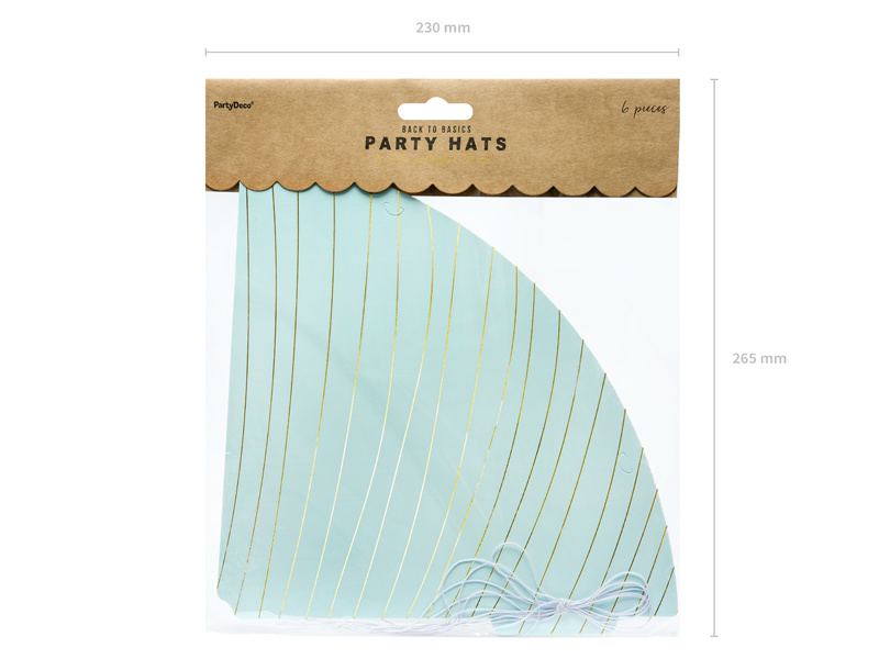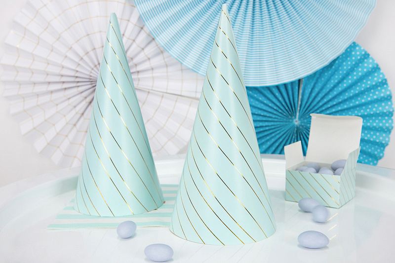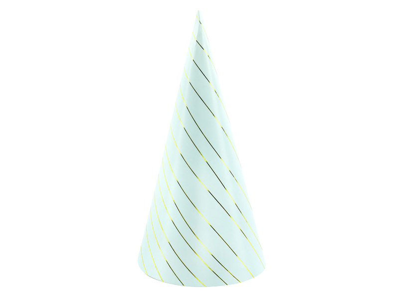 - Partyhoedjes Lichtblauw Met Gouden Strepen- Aantal: 6 stuks per verpakking- Zelf in elkaar te zetten- Afmetingen: 21cm hoog, 9,5cm diameter- Materiaal: Karton- Voorzien van elastiek