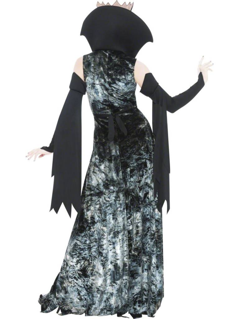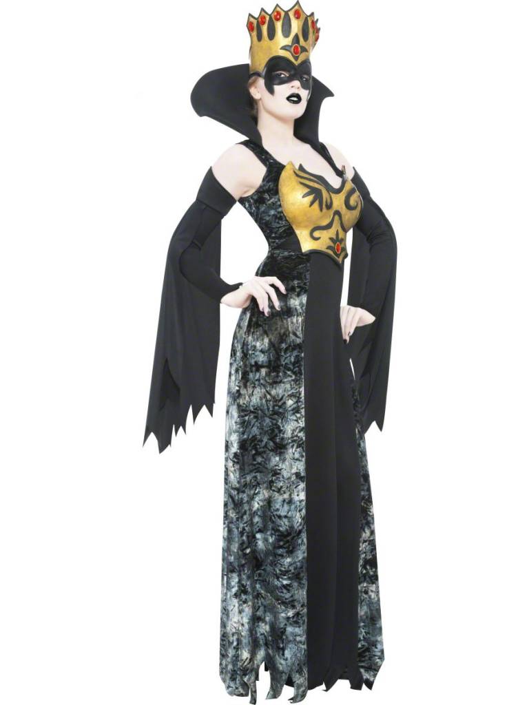 -Phantom Koningin kostuum bestaande uit: lange jurk, losse mouwen, latex plaat voor op de borst, kroon met masker.