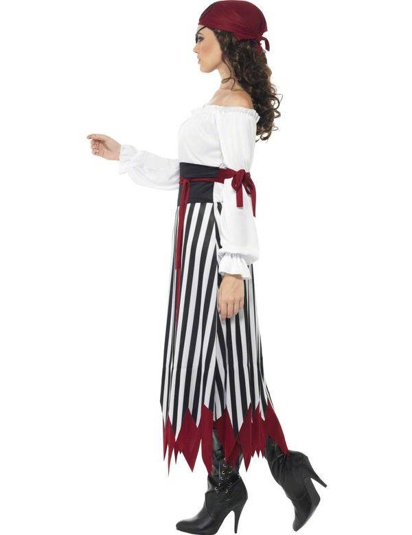 Pirate verkleedkleding dame lang bestaande uit: Jurk met Armbanden, Riem, Bandana