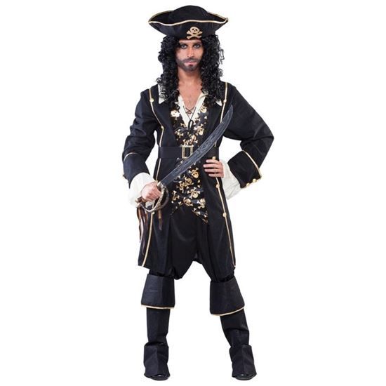 - Piratenkostuum zwart/goud man- Bestaande uit: Jas, broek, gilet met riem, laarskappen en hoed- One size (M/L)