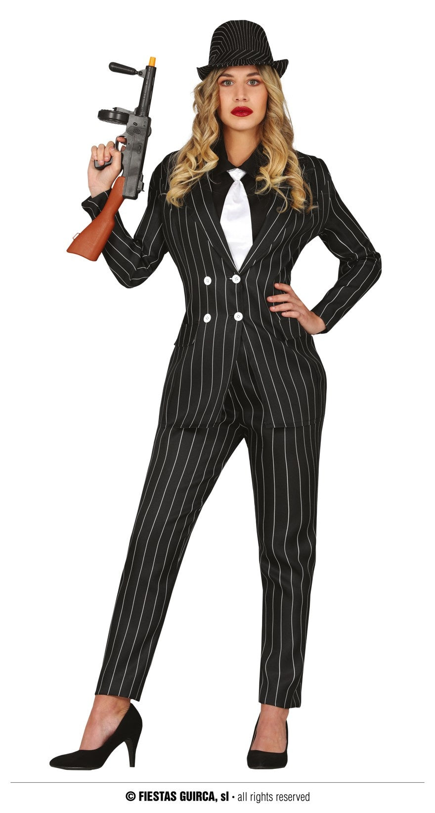 - Gangster Krijtstreep Kostuum Dames - Bestaat uit: Jasje, broek en overhemd met stropdas - Beschikbare maten: S, M en L - Materiaal: 100% Polyester Exclusief accessoires!
