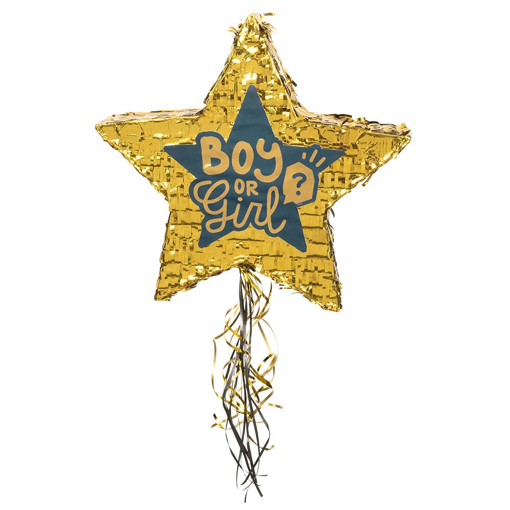 - Gender Reveal Pinata Ster Boy or Girl - Afmetingen: 44 x 44 x 8 cm - Wordt standaard leeg geleverd (kan gevuld worden met een gift of snoep) - Kleur: goud & blauw