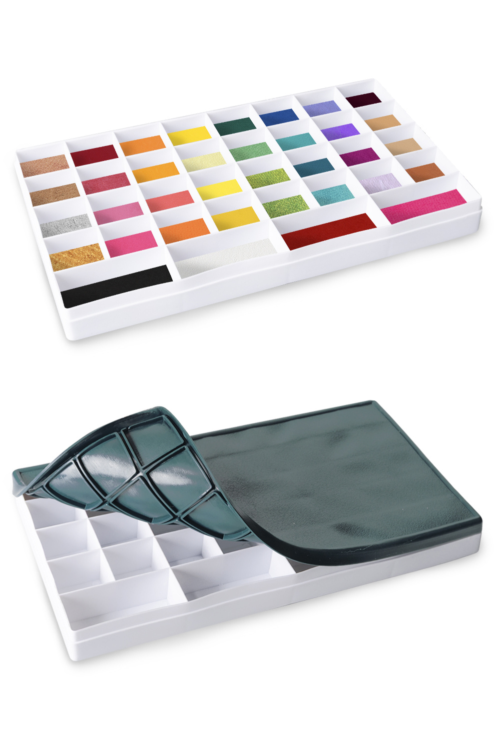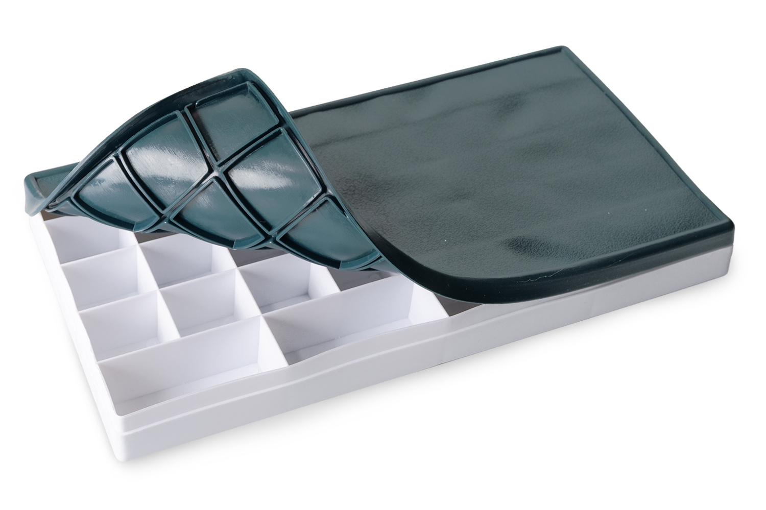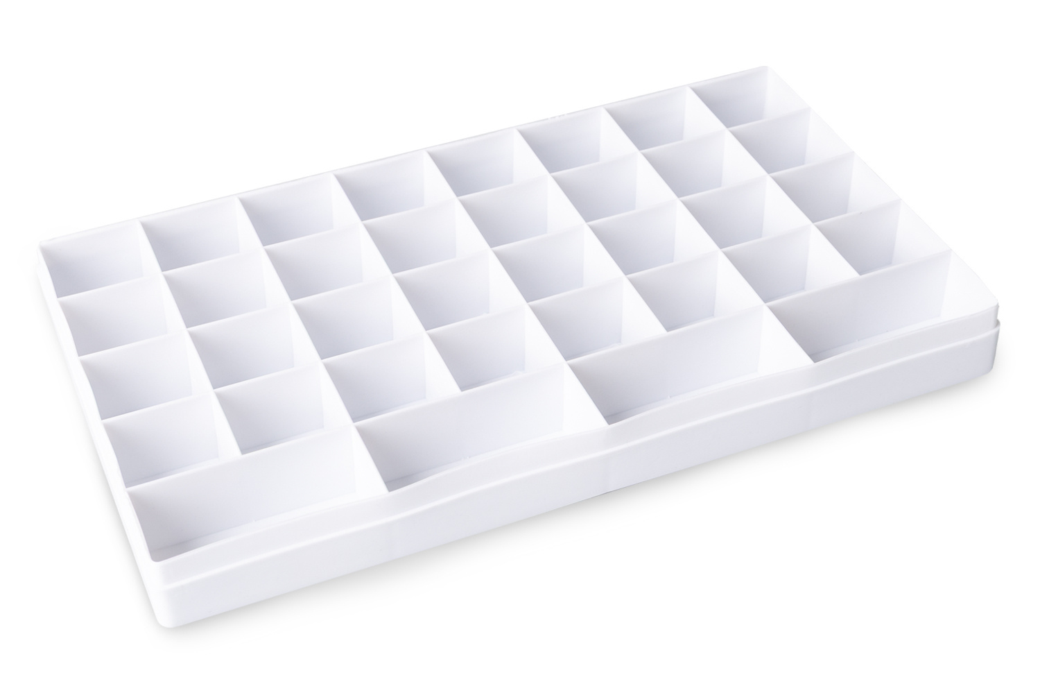 Ideale PXP doos voor on the job in je koffer, hij past perfect in onze 43297 make-up case. (28 x 16 x 3 cm) Verdeel de PXP schmink per kleur over de 32 kleinere, hard plastic vakken (3 x 3.5 x 1.5 cm) en de meest gebruikte kleuren in de 4 grotere vakken (3 x 7 x 1.5 cm).