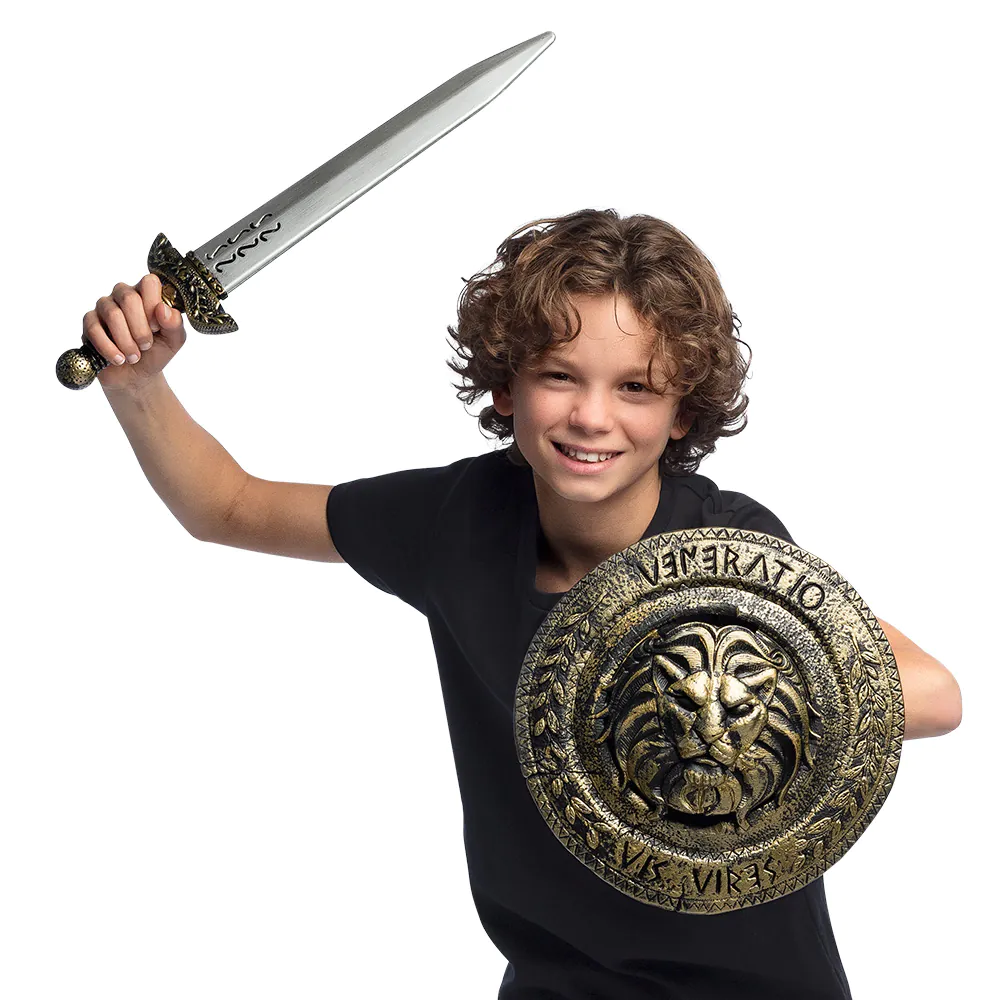 Een stoer 2-delig wapenset waar elk kind enthousiast van wordt. De set bestaat uit een zwaard met gouden handvat en bijpassend gouden schild met leeuwenkop. Een mooie accessoireset om een stoer ridder, viking of romeins gladiator kostuum compleet te maken voor Carnaval. Ook erg leuk als cadeautje!