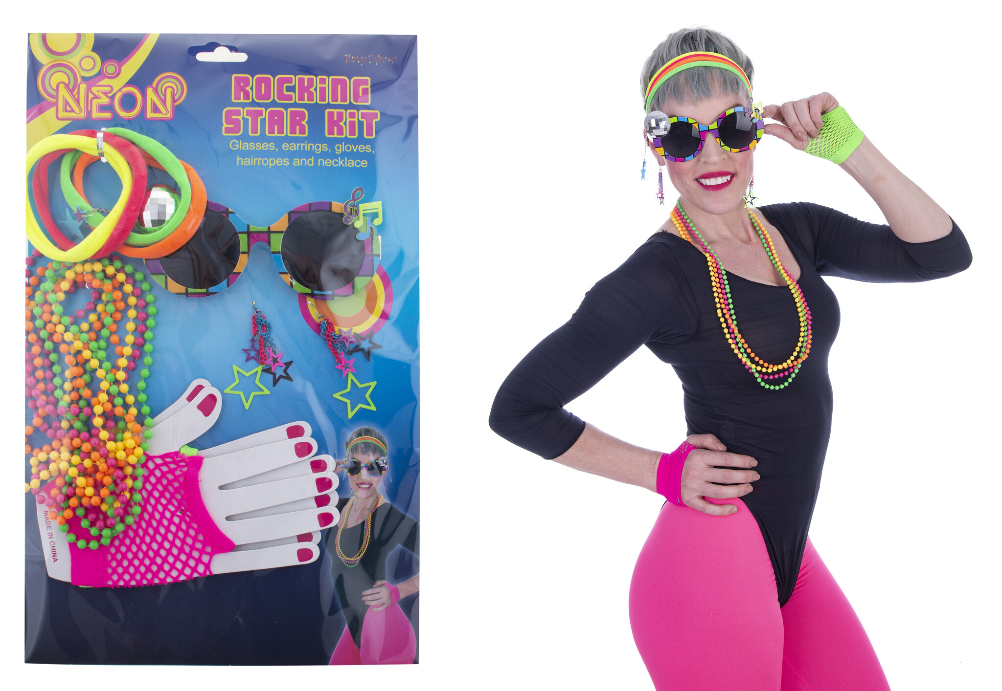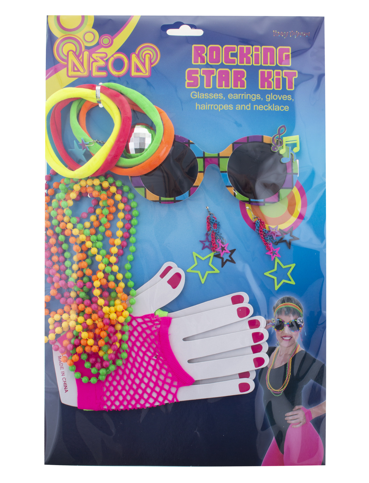 - Rocking Star Set 5-Delig- Bestaande uit: Zonnenbril, oorbellen, nethandschoenen, haarelastiekjes, ketting- Materiaal: Polyester, PVC