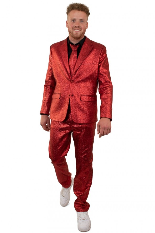 Rode kostuum metallic 3-deligBevat: Broek, Colbert, StropdasMateriaal: 100% PolyesterUitgebreide informatie:Colbert:-Gevoerd-Paspelzak met klep en knoopsluiting-Decoratieve mouwsplit met knopen-Decoratieve borstzakBroek:-Steekzakken-Tailleband met riemlussen en elastiek-Gulp met knoop en ritssluiting