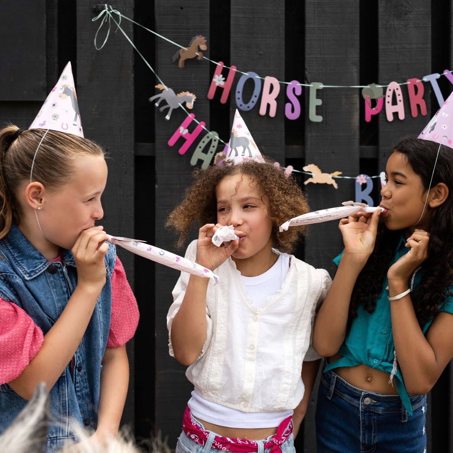 Feestelijke toeters met paardje. Roltongen - Happy Horses - 6 stuks. Inhoud: 6 roltongen. Bijvoorbeeld te gebruiken tijdens de volgende feestgelegenheid/feestgelegenheden: Kinderfeestje, Verjaardag, Themafeest. Deze 6 gezellige roltongen zijn zachtroze en dubbelzijdig bedrukt met vrolijke figuren die passen bij vrolijke paardjes. Ze hebben een kartonnen paardje als extra decoratie. Uitgerold zijn de roltongen ongeveer 28 cm. Het mondstuk is plactic, wit en 5 cm lang. Het rolgedeelte is 4 cm breed en 23 cm lang (uitgerold). Ingerold zijn de roltongen ongeveer 11 cm. Deze roltongen horen bij de Happy Horses collectie van Folat. Dit artikel is gemaakt van papier.