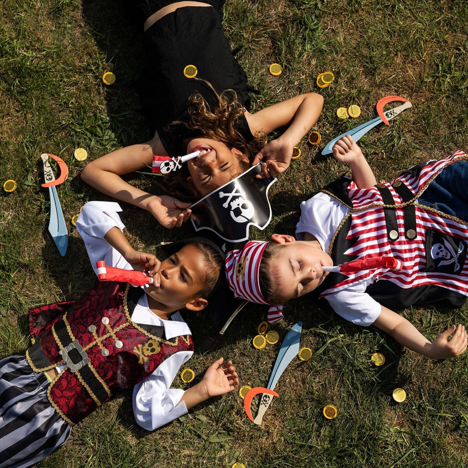 Vol blaasplezier op de zeven zeeën. Deze 6 spannende roltongen zijn bedrukt met een Pirat Party patroon en hebben een kartonnen doodskop als extra decoratie. Uitgerold zijn de roltongen ongeveer 40 cm. Het mondstuk is wit en 6 cm lang. Het rolgedeelte is 4 cm breed en 24 cm lang (uitgerold). Ingerold zijn de roltongen ongeveer 10 cm