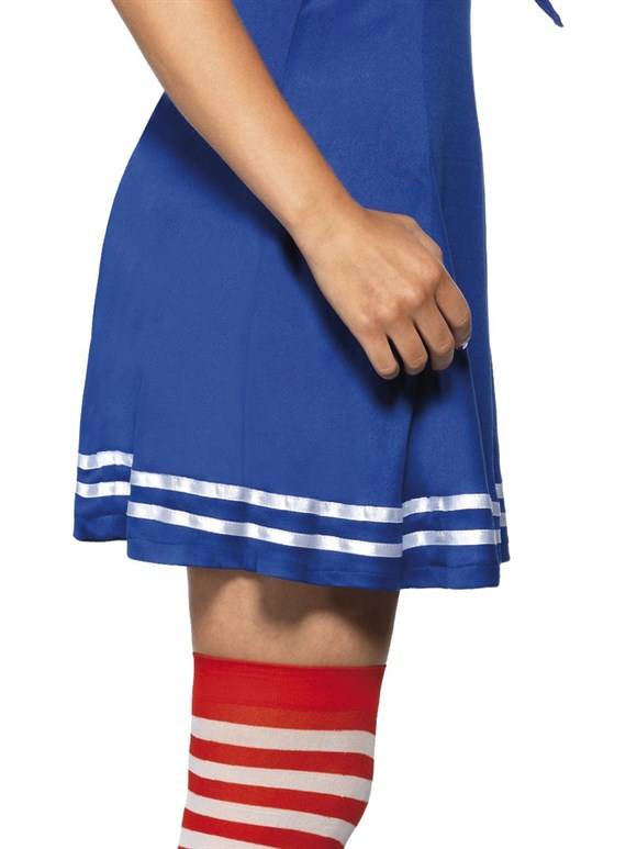 -Sailor Toppers cutie kostuum bestaande uit de blauwe jurk met kraag detail, de blauwe baret met rode strik en de gestreepte kousen.
