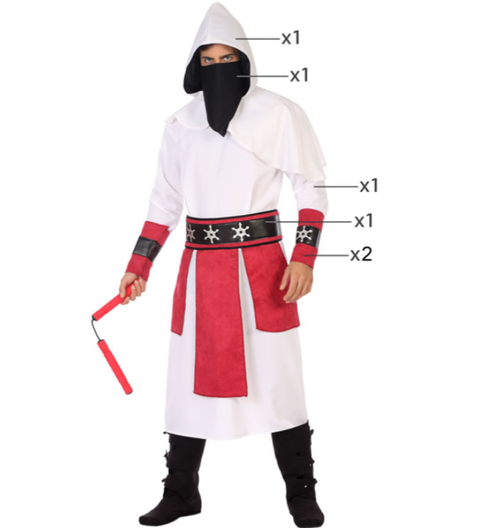 - Samurai Ninja Outfit Heren Wit/Rood - Bestaande uit: Jurk, Riem, Hoofdkap, Mondkap, 2 Manchetten- Beschikbare maten: M/L - Materiaal: Polyester