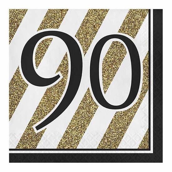 - Servetten '90' Zwart/Goud- 16 stuks per verpakking- Afmetingen: 33 x 33 cm- Materiaal: Papier