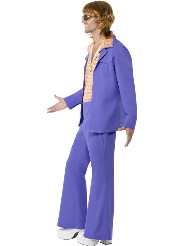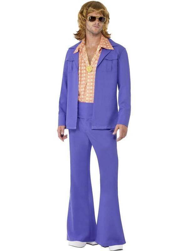 -Seventees verkleedkostuum heren bestaande uit het paarse pak met paarse jas en broek en voorkant van het shirt.