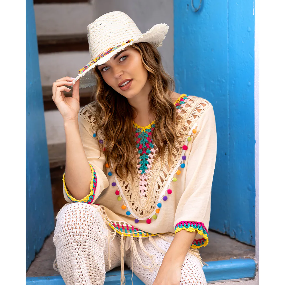 Ga stijlvol de zomer in met deze prachtige witte bohemian hoed, welke is afgewerkt met kleurrijke details. Of je nu naar een strandfeestje gaat, een festival bezoekt of lekker in de zon ontspant op Ibiza, deze hoed beschermt je niet alleen tegen de zon, maar geeft je ook een trendy uitstraling.