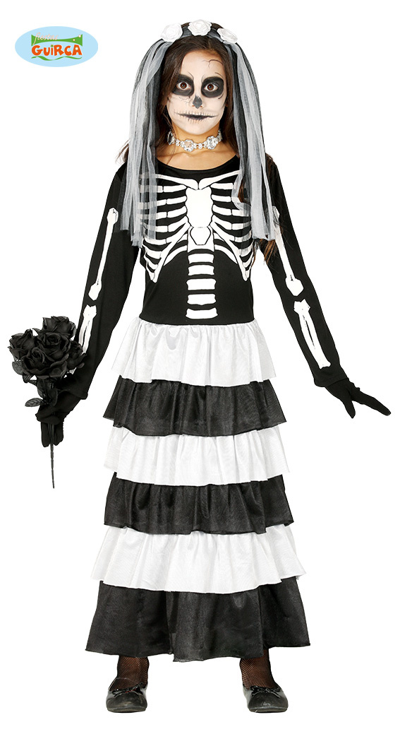 - Skelet Bruid Kostuum Kind- Beschikbare maten: 3-4 jaar, 5-6 jaar, 7-9 jaar en 10-12 jaar- Bestaande uit: Jurk en hoofdband- Materiaal: 100% PolyesterExclusief accessoires!