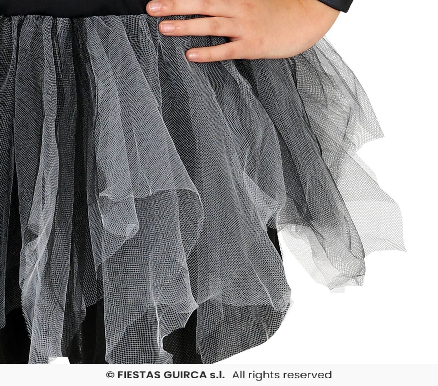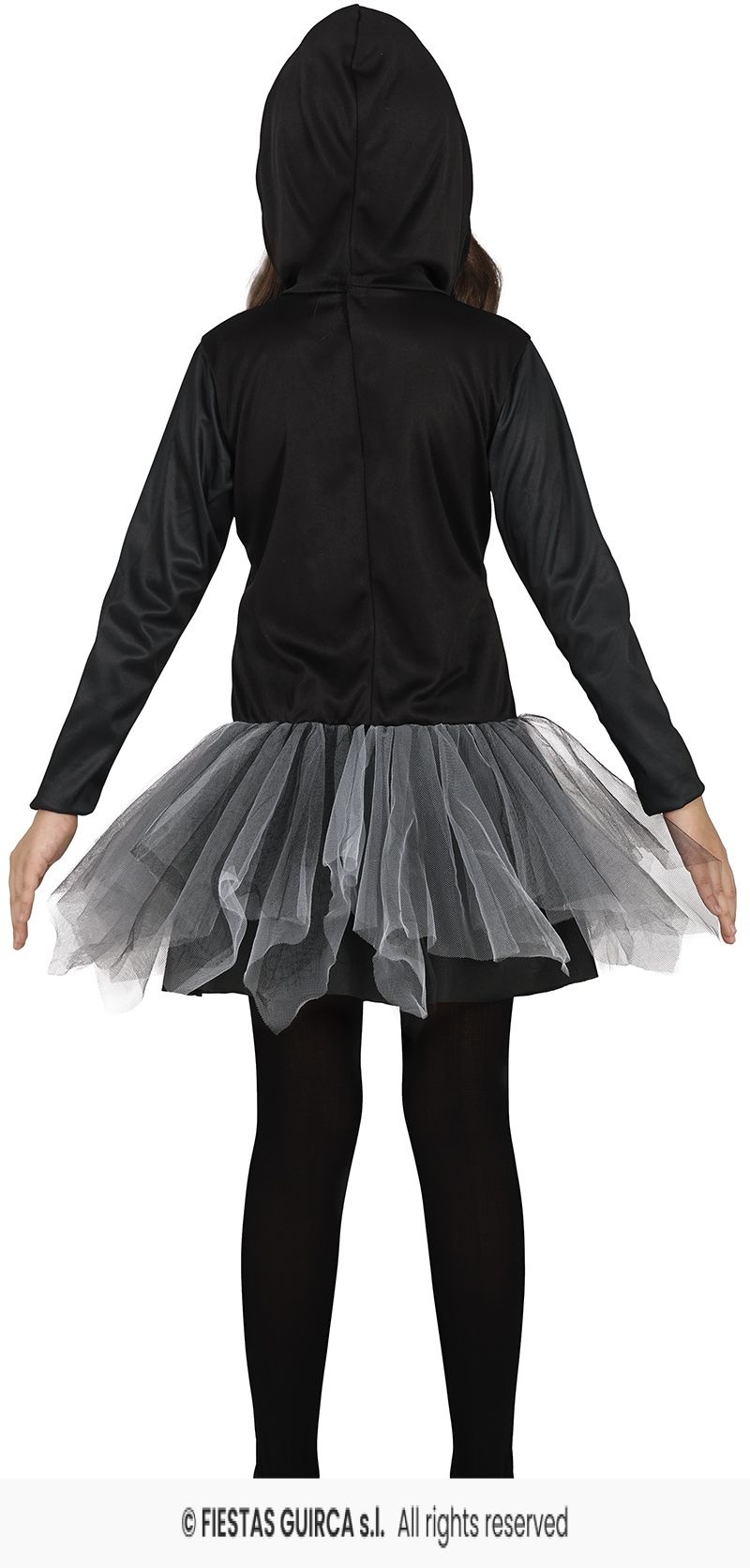 Dit griezelige skeletkostuum voor meisjes is perfect voor Halloween of verkleedpartijtjes! Het kostuum bestaat uit een zwart jurkje met gedetailleerde skeletprint en capuchon, een tule rok en broek voor een extra mysterieuze look. Met de bijpassende make-up creëer je eenvoudig een angstaanjagende verschijning. Ideaal voor wie houdt van een spannende en stijlvolle outfit!