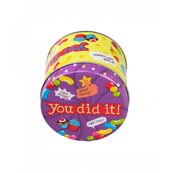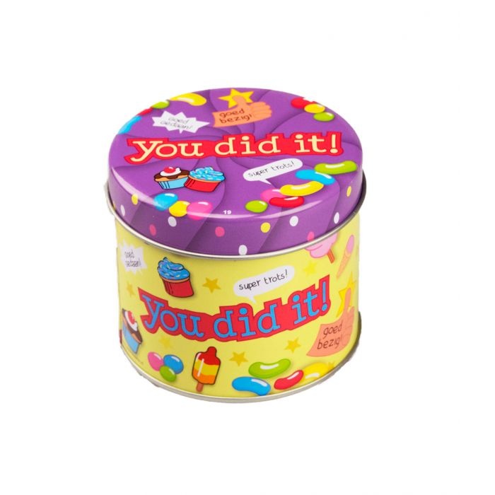 - Snoepblik 'You did it'- Afmetingen: Hoogte 7.5cm/ diameter 8cm- Materiaal: blikEen snoepblik met grappige teksten en tekeningen voor iemand die geslaagd is! Leuk om te vullen met snoep, koekjes, nootjes of bijvoorbeeld geld.