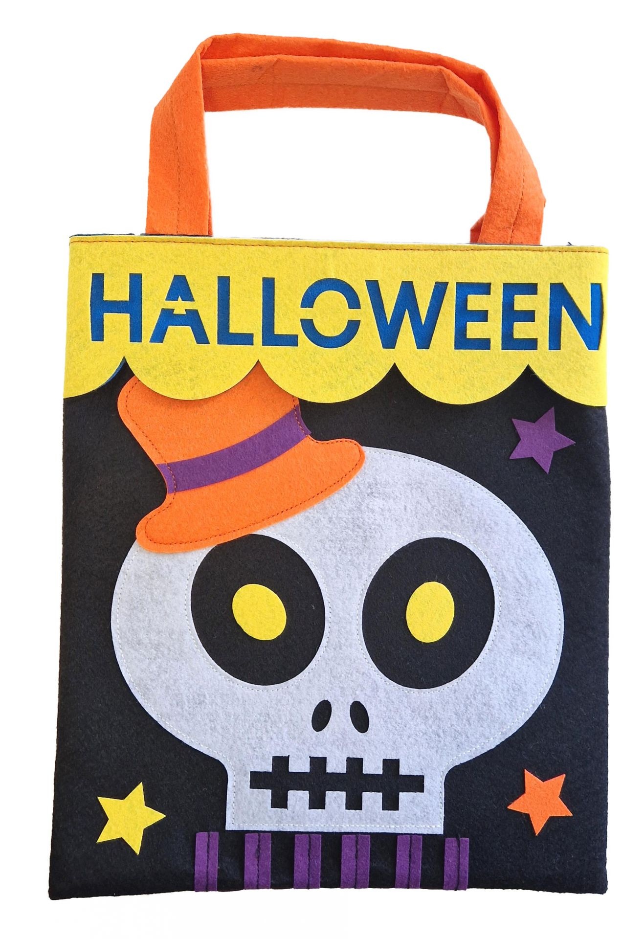 - Snoeptas Halloween Doodskop- Materiaal: Vilt (100% polyester)- Afmetingen: 27cm x 32cm- Details: Bevat 2 handvatten