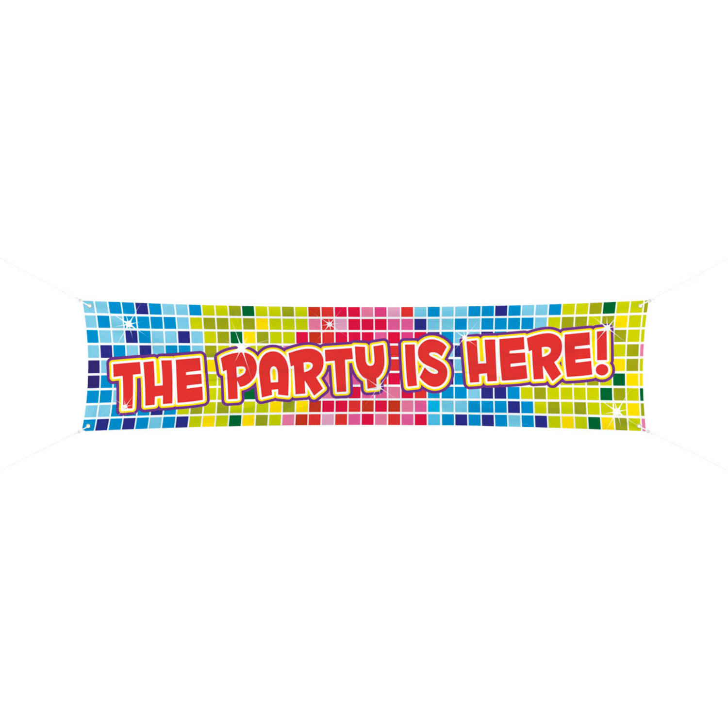 - Spandoek The Party Is Here- Afmetingen: 180 x 40cm- Materiaal: Polyester- Inclusief ringen en touwtjes in de hoeken van het spandoek- Enkelzijdig bedrukt