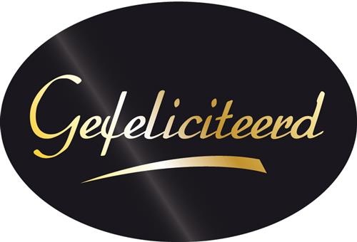- Stickers 'Gefeliciteerd' zwart/goud- Breedte ± 3,5 - 4 cm- Prijs per sticker- Minimale afname 10 stickers