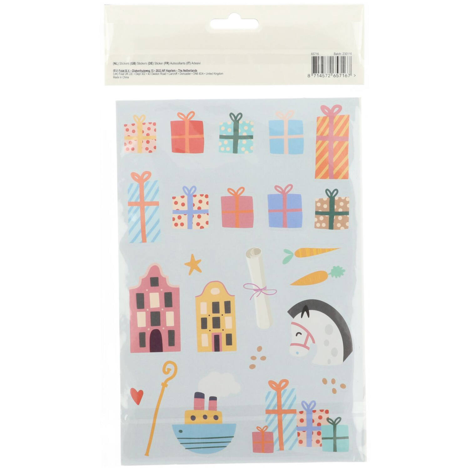 Deze vrolijke en typische Sinterklaas figuren zijn onmisbaar op ieder Sinterklaasfeest. Er zijn totaal 49 meerkleurige stickers, verdeeld over 4 stickervellen welke 15 x 22,5 cm zijn.
