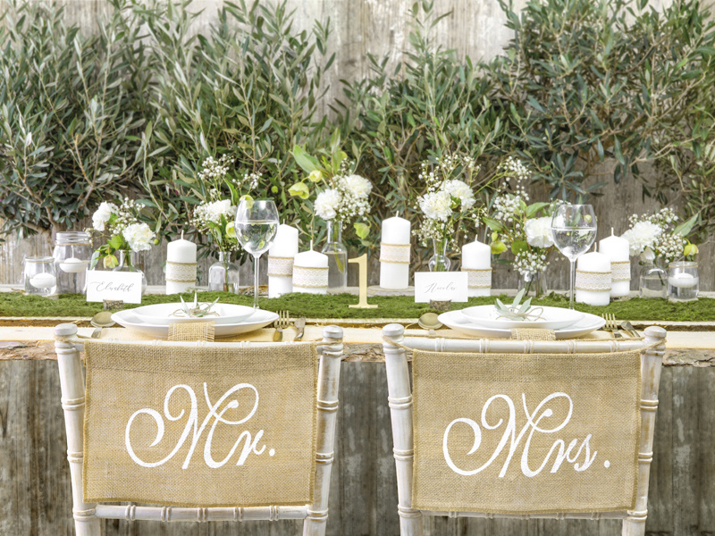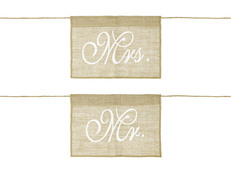- Stoelversiering Bruiloft Mr. en Mrs.- Voorzien van touw om de versiering aan de stoel te bevestigen- Afmetingen: 30 x 21.5 cm- Materiaal: Jute
