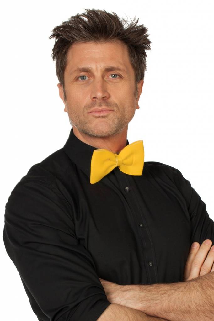 - Strikje geel- Afmetingen: 13,5 x 7,5cm- Voorzien van zwart elastisch bandje