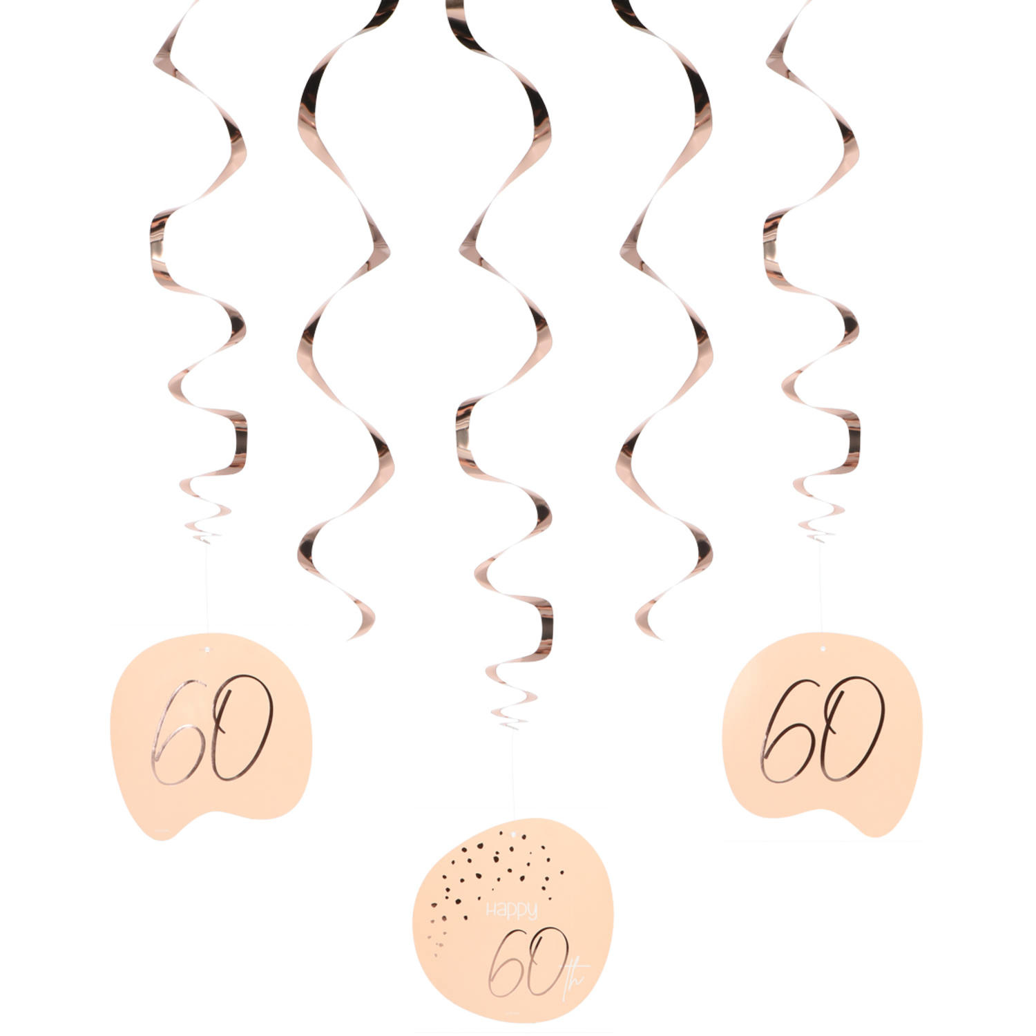- Swirls Elegant Blush 60 Jaar- Aantal: 5 Swirls- Afmetingen: 75 x 14cm- Materiaal: Karton en folie- Dubbelzijdig bedrukt- Kleur: zalm/rosé